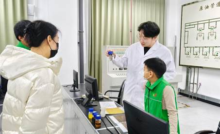 活动第一项为专业讲解环节。讲解员围绕石油勘探开发的全流程,依次在钻井工艺、油气开采和油气储运三大实训区域展开科普讲解。他从钻井工程的基本原理入手,介绍了现代钻井技术与装备的发展;通过开采工艺的演进,阐释了不同类型油藏的开发方式;结合原油样品与处理流程,说明了油气集输与初步加工的关键技术。整场讲解系统清晰,将复杂的石油工程知识转化为易于理解的科普内容。
